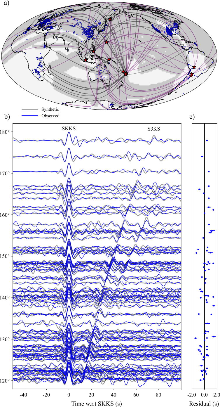 The Earth’s magnetic field, which protects us from solar radiation, is generated by fast convection in the liquid metal Outer Core (OC) at 2891 km to 5150 km depth. However, the driving force behind this convection is still uncertain due to the challenges in direct observation. Utilizing the seismic waves generated by large earthquakes that penetrate the OC, seismologists provide the most important reference, the seismic velocity profile, for other geoscientists to constrain their chemical composition and convection models. Seismic observation of the OC is always limited by low data quality and complicated lower mantle structure. The motivation of this project is to overcome these difficulties and constrain the velocity structure in the outermost OC with a high-quality dataset and a new measurement method based on full 3-D elastic wavefield simulation by AxiSEM3D (Leng et al., 2019).